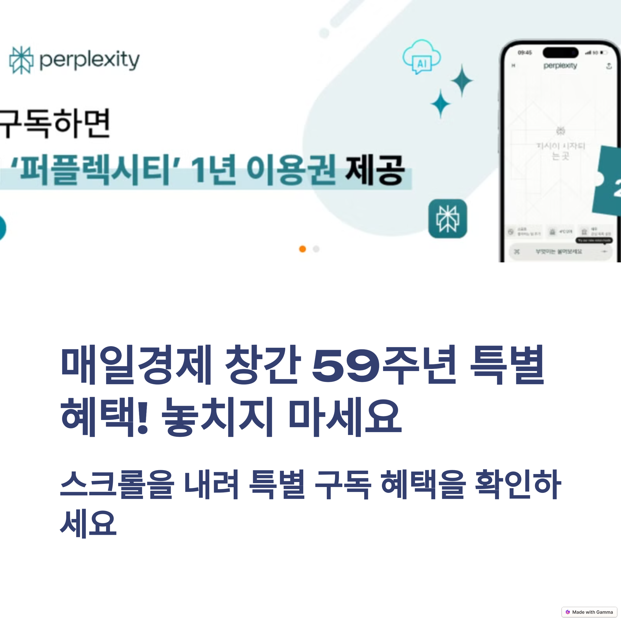 매일경제가 창간 59주년을 기념해 퍼플렉시티 AI 1년 무료 이용권(약 29만 원 상당)을 제공하는 역대급 이벤트를 진행 중이라구요! 📢