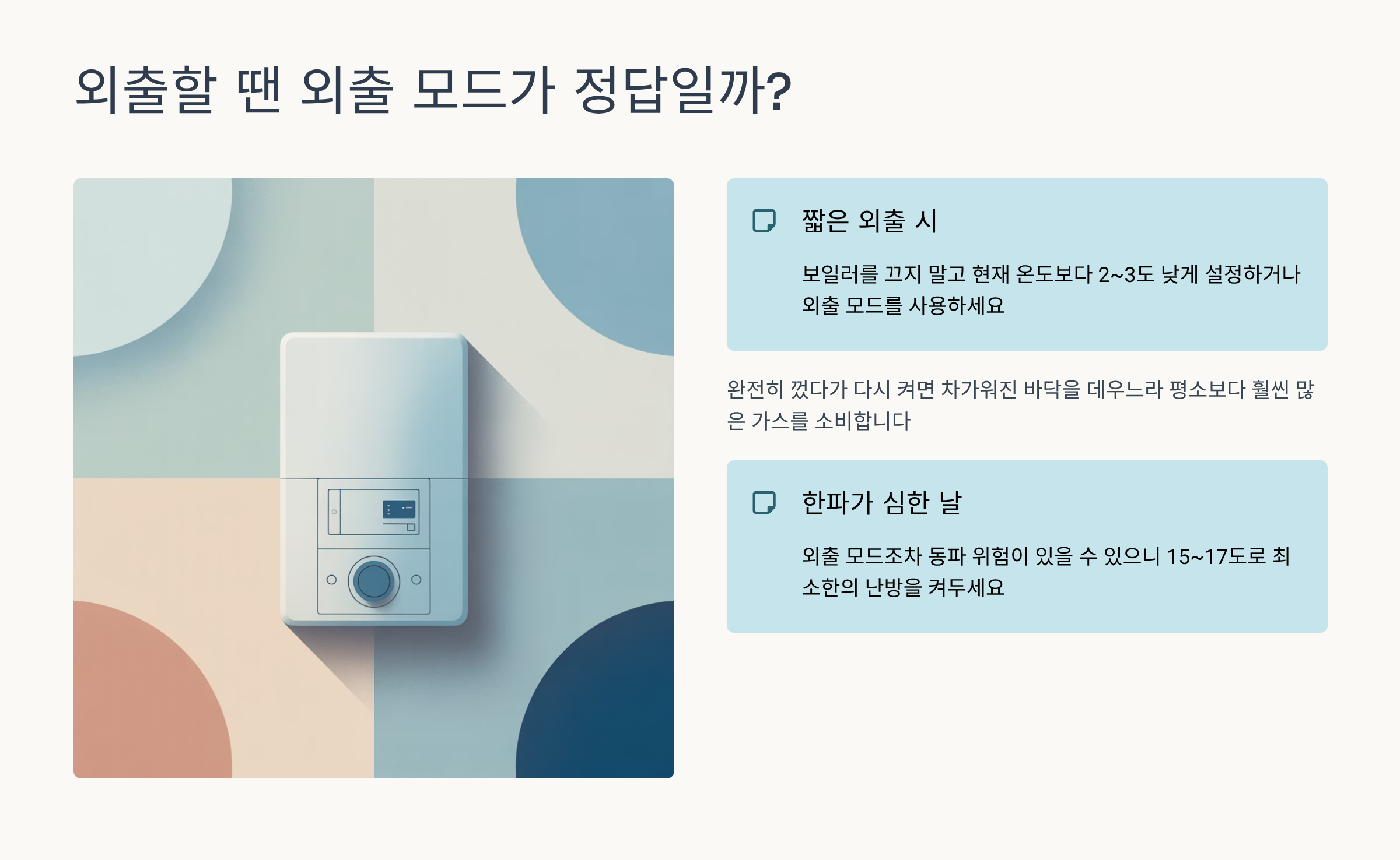 단, 한파가 심한 날에는 외출 모드조차 동파 위험이 있을 수 있으니, 15~17도 정도로 '최소한의 난방'을 켜두는 것이 안전합니다.