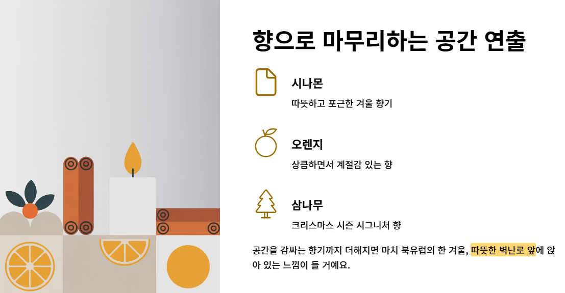 시나몬, 오렌지, 삼나무 향의 캔들이나 디퓨저는 크리스마스 시즌에 딱 어울리는 향이에요.