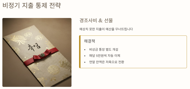 경조사비나 명절 선물 등 비정기적으로 발생하는 지출은 예산 계획에 포함시키지 않으면 갑자기 '마이너스'를 유발합니다.