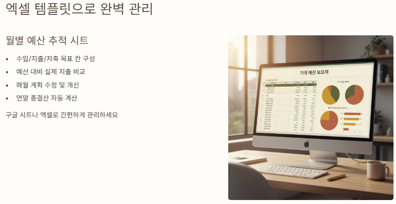 - 예산 4분면: (1)고정비, (2)변동비, (3)비정기 지출(경조사), (4)저축/투자로 나누어 관리하면 더욱 체계적입니다.