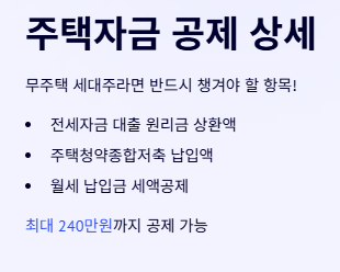 주택청약종합저축에 납입한 금액도 무주택 세대주 기준으로 최대 240만 원까지 공제돼요.